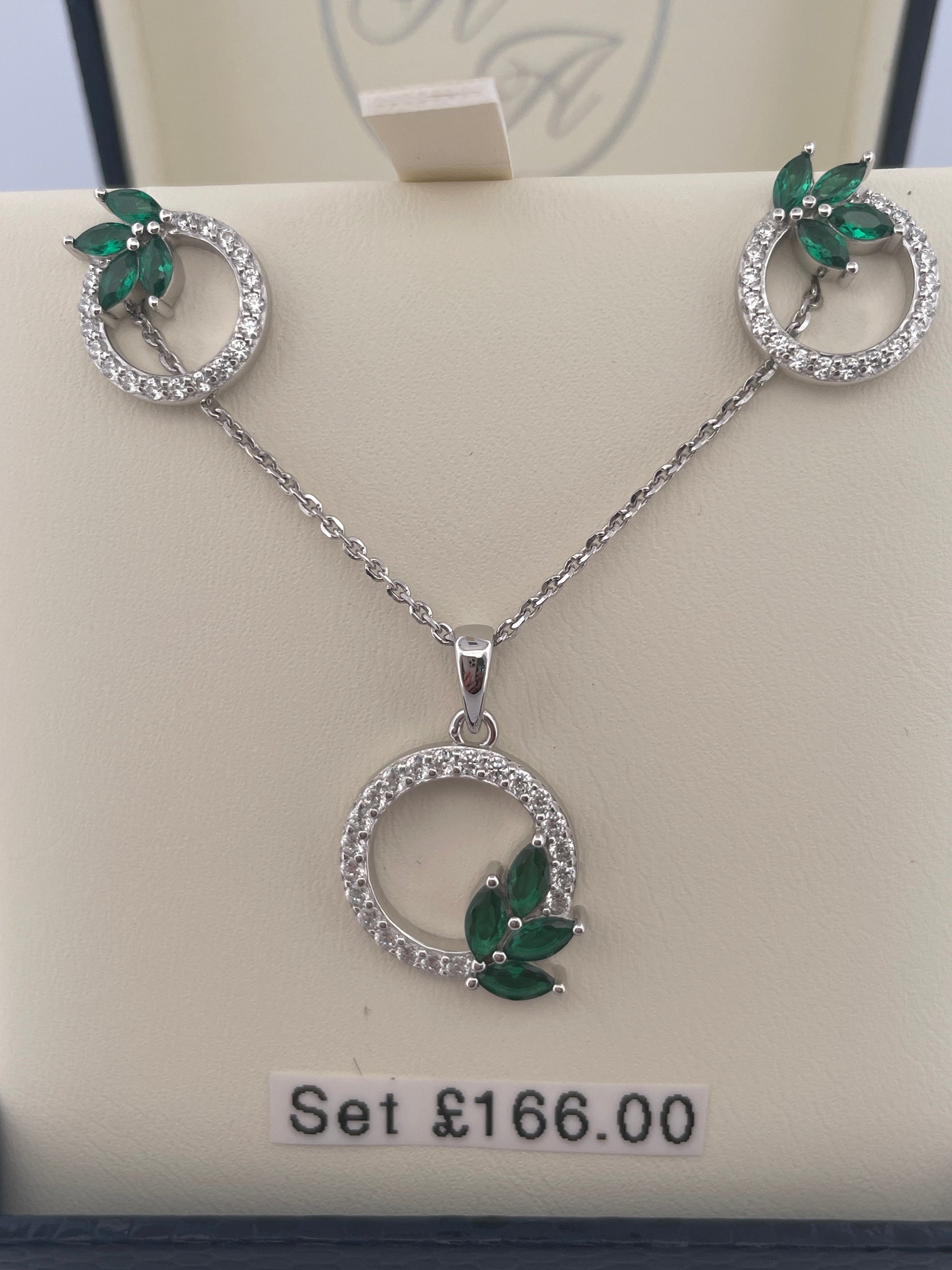 Silver green c.z leaf and circle earring and pendant set. Necklace £90.00 earrings £76.00
